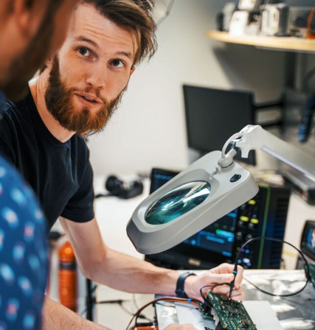 Framgångsrik och hållbar teknikutveckling kräver att man kan växla perspektiv från den stora bilden till de små detaljerna. All utveckling tar avstamp i våra kunders marknadsförutsättningar i dag och i framtiden. I den senare delen av processen säkerställer vi tekniska lösningar som klarar alla tester och levererar med hög pålitlighet och prestanda.